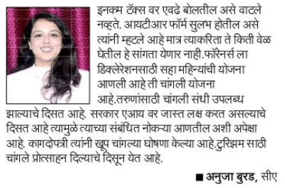 इनकम टॅक्स वर एवढे बोलतील असे वाटले नव्हते. आयटीआर फॉर्म सुलभ होतील असे त्यांनी म्हटले आहे मात्र त्याकरिता ते किती वेळ घेतील हे सांगता येणार नाही. फॉरेनर्स ला डिक्लेरेशनसाठी सहा महिन्यांची योजना आणली आहे ती चांगली योजना आहे. तरुणांसाठी चांगली संधी उपलब्ध झाल्याचे दिसत आहे. सरकार एआय वर जास्त लक्ष करत असल्याचे दिसत आहे त्यामुळे त्याच्या संबंधित नोकऱ्या आणतील अशी अपेक्षा आहे. कागदोपत्री त्यांनी खूप चांगल्या घोषणा केल्या आहे. टुरिझम साठी चांगले प्रोत्साहन दिल्याचे दिसून येत आहे